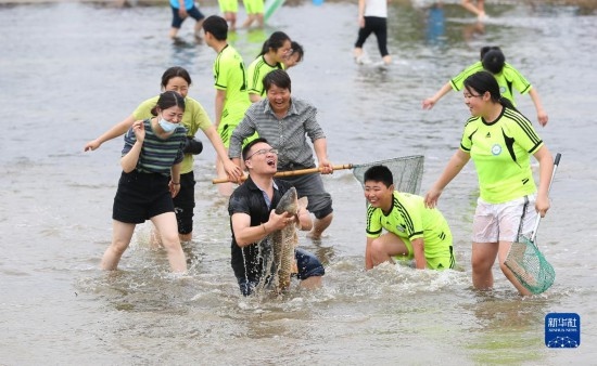 5月30日,在淮安市洪澤區(qū)岔河鎮(zhèn),人們在捉魚比賽活動現(xiàn)場。