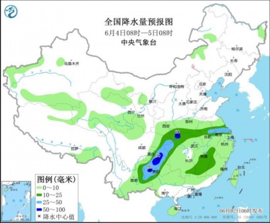 2日至4日,青海東部、甘肅南部、陜西南部、四川東部、重慶、貴州、湖北西部及河南南部、安徽北部等地部分地區(qū)將有中到大雨,局地有暴雨或大暴雨,并伴有雷暴大風(fēng)或短時(shí)強(qiáng)降水等強(qiáng)對(duì)流天氣。其中,6月2日08時(shí)至3日08時(shí),黑龍江東南部、貴州北部等地的局地將有雷暴大風(fēng)或冰雹天氣;黑龍江東南部、湖北西部、湖南東南部、江西南部、四川東部、重慶、貴州中西部和東北部、云南南部、廣西北部、廣東東部和北部等地的部分地區(qū)將有短時(shí)強(qiáng)降水天氣,小時(shí)雨量20~40毫米,局地可達(dá)50毫米以上。