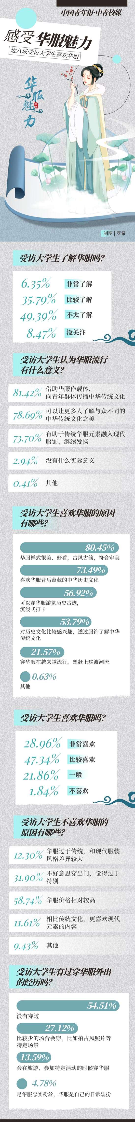 穿華服正在成為一些年輕人旅游或日常出行的選擇。“華服”,是指具有中華民族歷史文化基因、精神風(fēng)貌,且融合當(dāng)代審美的禮儀性服裝,其服裝風(fēng)格根植于中華傳統(tǒng)文化,傳承中華民族特質(zhì),體現(xiàn)當(dāng)代社會(huì)積極向上的時(shí)代精神,具有鮮明的辨識(shí)度,適用于國(guó)際交往、文化交流、商貿(mào)往來以及日常節(jié)慶、典祭等禮儀場(chǎng)合。自2018年起,每年的農(nóng)歷三月初三被選定為“中國(guó)華服日”,在前不久結(jié)束的第五屆“中國(guó)華服日”活動(dòng)中,上萬名青年華服愛好者匯聚活動(dòng)現(xiàn)場(chǎng)參與體驗(yàn)。近日,中國(guó)青年報(bào)社·中青校媒面向全國(guó)高校大學(xué)生發(fā)起問卷調(diào)查,共回收117所高校學(xué)生填寫的有效問卷1464份。調(diào)查結(jié)果顯示,76.30%受訪者表示喜歡華服,42.14%受訪者表示對(duì)華服有一定的了解。