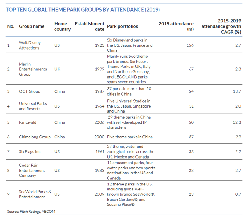 惠譽(yù)評級今年4月發(fā)布的主題公園藍(lán)皮書(Fitch China Theme Park Industry Blue Book)則顯示,從2019年全球各大主題公園集團(tuán)旗下樂園的游客量來看,迪士尼公司以2019年全年15.6億人次的游客量穩(wěn)居第一。排名第二的為英國默林集團(tuán)旗下度假區(qū)及樂高樂園的游客量,約6700萬人次,不及迪士尼公司游客量的一半。