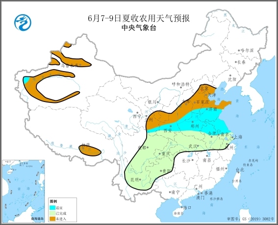 預(yù)計(jì)6月7-9日,夏收區(qū)大部多晴好天氣,利于搶晴收曬已成熟冬小麥和加快夏收進(jìn)度;河南、陜西等地前期降水偏多地區(qū)的低洼麥田漬澇將減輕,為麥?zhǔn)諜C(jī)械化作業(yè)逐步創(chuàng)造條件。未來3天,河北中東部和南部、河南北部、山西東南部、山東西部、安徽東部等地的局部地區(qū)將有雷暴大風(fēng)或冰雹等強(qiáng)對(duì)流天氣,冬小麥點(diǎn)片倒伏風(fēng)險(xiǎn)較高,對(duì)未成熟小麥籽粒充分灌漿不利,并將增加已成熟小麥機(jī)收難度。7-14日華北、黃淮、新疆等地部分地區(qū)將有35℃以上高溫天氣,局地日最高氣溫在37℃以上,上述地區(qū)堆積的濕麥發(fā)熱霉變的風(fēng)險(xiǎn)較高,新疆冬小麥遭受干熱風(fēng)災(zāi)害的風(fēng)險(xiǎn)也較高。