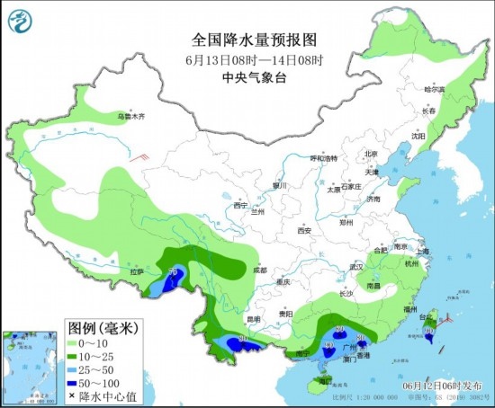 圖2 全國降水量預(yù)報圖(6月12日08時-13日08時) 圖片來源:中央氣象臺網(wǎng)站