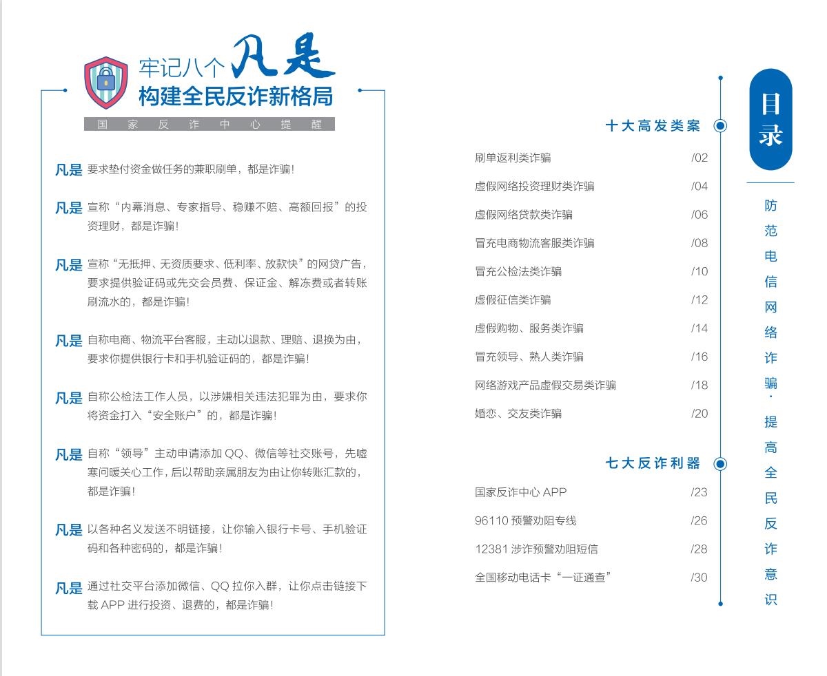 人民網(wǎng)北京6月16日電 (記者郝萍、梁秋坪)按照中央宣傳部、公安部聯(lián)合部署開(kāi)展的“全民反詐在行動(dòng)”集中宣傳月活動(dòng)有關(guān)要求,國(guó)家反詐中心編寫制作并最新推出《2023版防范電信網(wǎng)絡(luò)詐騙宣傳手冊(cè)》(以下簡(jiǎn)稱《手冊(cè)》),詳細(xì)梳理10類高發(fā)電信網(wǎng)絡(luò)詐騙案件特點(diǎn)和詐騙手法,深入介紹7大反詐利器的主要功能和使用方法,進(jìn)一步擴(kuò)大反詐宣傳覆蓋面,提升廣大群眾識(shí)騙防騙意識(shí)和能力。