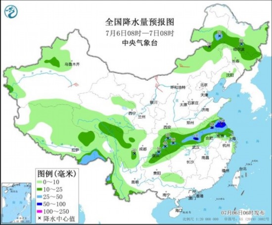 全國降水量預報圖(7月6日08時-7日08時)。圖片來源:中央氣象臺網(wǎng)站