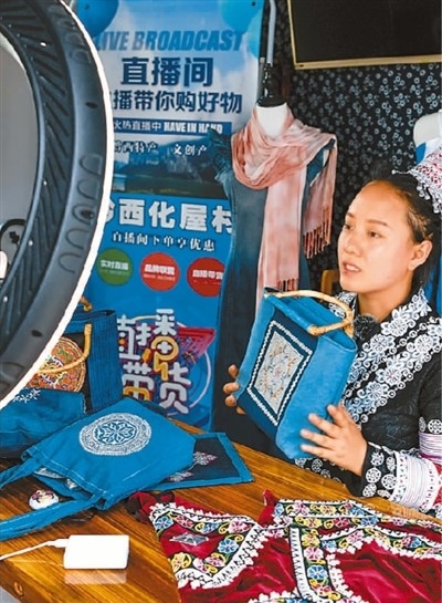在貴州省新仁苗族鄉(xiāng)化屋村的文創(chuàng)產品直播間,繡娘推介苗繡文創(chuàng)產品。