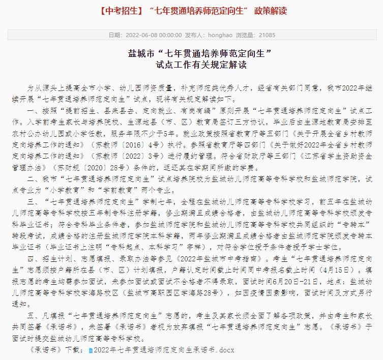 記者從鹽城幼兒師范高等??茖W(xué)校官網(wǎng)看到,鹽城市從2021年起開始試點(diǎn)培養(yǎng)“七年貫通師范定向生”,試點(diǎn)培養(yǎng)院校為鹽城幼兒師范高等??茖W(xué)校和鹽城師范學(xué)院,試點(diǎn)專業(yè)為“小學(xué)教育”和“學(xué)前教育”兩個專業(yè)。