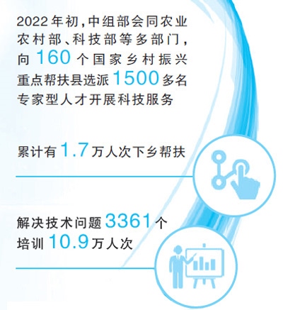 2022年初,中組部會(huì)同農(nóng)業(yè)農(nóng)村部、科技部等多部門,以“一縣一團(tuán)”方式,向160個(gè)國家鄉(xiāng)村振興重點(diǎn)幫扶縣選派1500多名專家型科技支撐人才,精準(zhǔn)開展科技服務(wù)和人才培養(yǎng)幫帶。