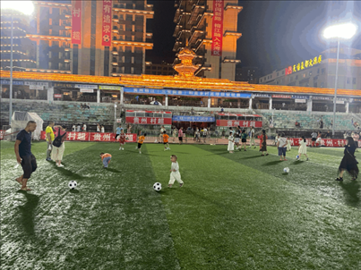 在比賽間隙和結(jié)束后,觀眾席上的孩子們會沖進球場,玩起傳球、盤帶和射門;工作日的晚上,“村超”體育場上,有很多踢球的身影,有中學(xué)足球隊的隊員,有八九歲的小學(xué)生,還有剛剛學(xué)會走路的小朋友。
