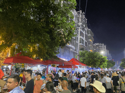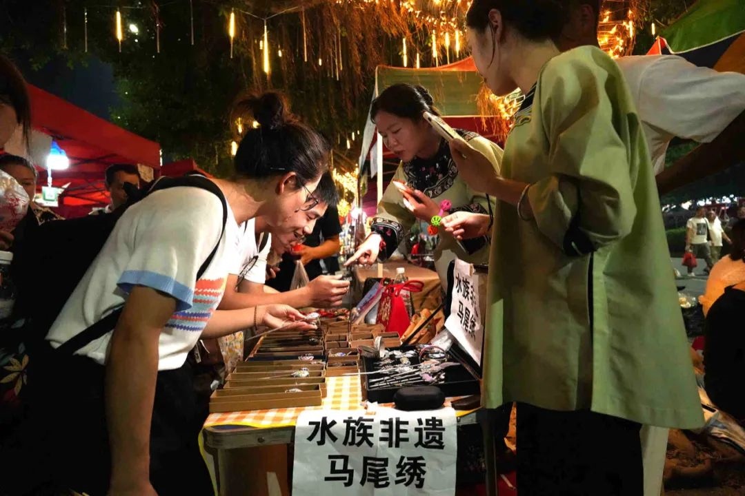 一位賣榕江卷粉、芋頭糕等特色小吃的小吃攤攤主說:“我們從早忙到晚,擺攤到凌晨1點鐘左右,人太多了,一天能賣幾百碗?!?/p>