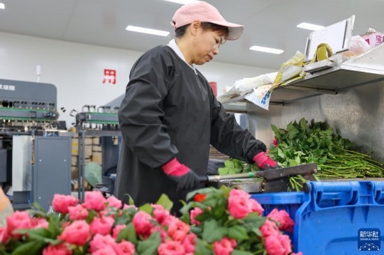 在云天化晉寧花卉產(chǎn)業(yè)現(xiàn)代化示范園內(nèi),花農(nóng)對鮮花進行簡單打包(7月12日攝)。新華社記者 陳欣波 攝