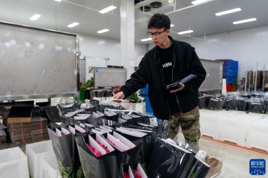 每天,由花農(nóng)采摘的鮮花進入分揀包裝車間,預(yù)冷、分級、包裝、入庫冷藏等工作井然有序地開展。經(jīng)過采后處理的鮮花一部分通過園區(qū)自有物流直接向客戶發(fā)貨,一部分則由專門的鮮花運輸車運往昆明國際花卉拍賣交易中心,開啟拍賣流程。