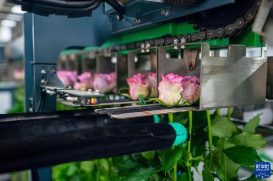 在云天化晉寧花卉產(chǎn)業(yè)現(xiàn)代化示范園內(nèi),花農(nóng)們將鮮切花自動分揀流水線上分揀好的鮮花取下,準(zhǔn)備放入包裝流水線(7月12日攝)。新華社記者 陳欣波 攝