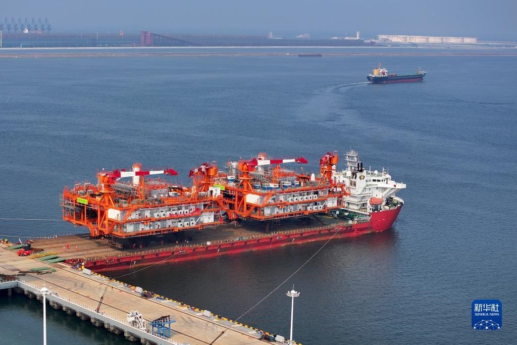 這是8月9日在天津濱海新區(qū)拍攝的渤中19-6凝析氣田I期開發(fā)項目組塊裝船作業(yè)現(xiàn)場(無人機照片)。組塊裝船后將赴渤海西部海域,進入海上安裝和聯(lián)調階段。