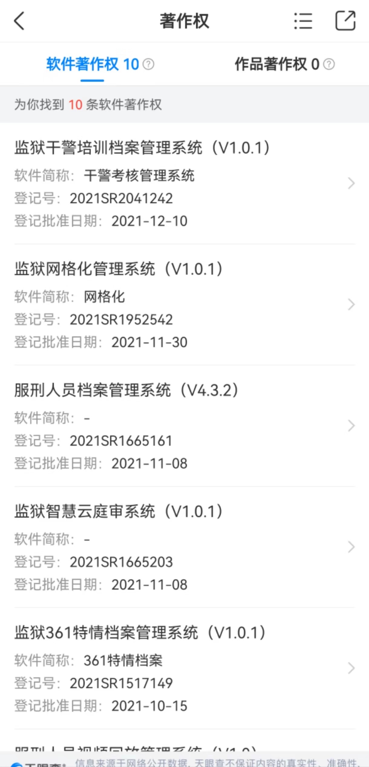 如上述立馳信息在官網(wǎng)中的自我介紹,澎湃新聞通過天眼查App檢索發(fā)現(xiàn),2021年一整年,立馳信息就獲批登記了包括上述“親情會(huì)見1.0”在內(nèi)的多個(gè)涉監(jiān)獄管理的系統(tǒng)。如監(jiān)獄固定資產(chǎn)管理系統(tǒng)、點(diǎn)名管理系統(tǒng)、服刑人員會(huì)見管理系統(tǒng)、監(jiān)獄干警培訓(xùn)檔案管理系統(tǒng)等共計(jì)10項(xiàng)。