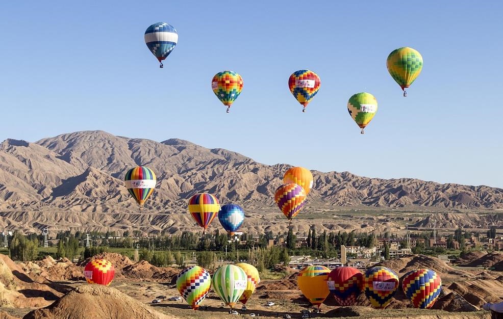來自全國各地的熱氣球運(yùn)動(dòng)員駕乘熱氣球,在甘肅張掖七彩丹霞上空進(jìn)行飛行表演,上演熱氣球與丹霞的美麗邂逅。