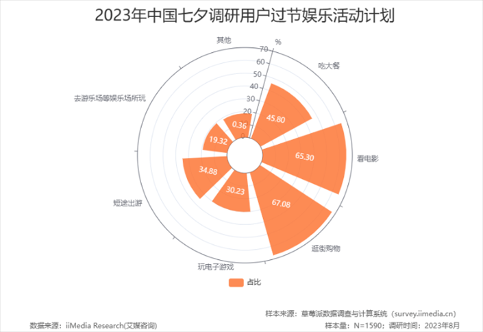 今年七夕恰逢工作日,大多數(shù)人選擇下班后再相聚。“中國(guó)七夕節(jié)日消費(fèi)行為大數(shù)據(jù)調(diào)查”顯示,2023年消費(fèi)者過(guò)節(jié)的娛樂(lè)活動(dòng)計(jì)劃TOP3分別為:逛街購(gòu)物、看電影、吃大餐。