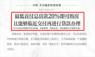 8月26日,紅星資本局向“中糧天悅”售樓部求證此時(shí),一名置業(yè)顧問(wèn)回復(fù)稱,最近確實(shí)推出了“先交付后還貸”的購(gòu)房政策,購(gòu)房者可以先交首付,簽訂購(gòu)房合同,交房前再辦理貸款即可。