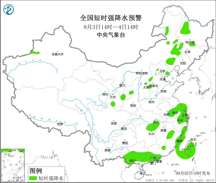 預(yù)計9月3日14時至4日14時,內(nèi)蒙古東南部、吉林西部、遼寧西部、山西中部、河北中部和東北部以及福建東部和西北部、廣西南部和東南部沿海、臺灣島等地的部分地區(qū)將有8-10級雷暴大風或冰雹天氣,局地可達11級以上;內(nèi)蒙古東部、黑龍江西部、吉林西部、遼寧西部、甘肅南部、山西中部、河北西部和東北部、江蘇中南部、安徽東部、上海、浙江北部、福建東部和西北部、廣西南部、廣東西南部、臺灣島等地的部分地區(qū)將有短時強降水天氣,最大小時雨量20-50毫米,局地可達70毫米以上。