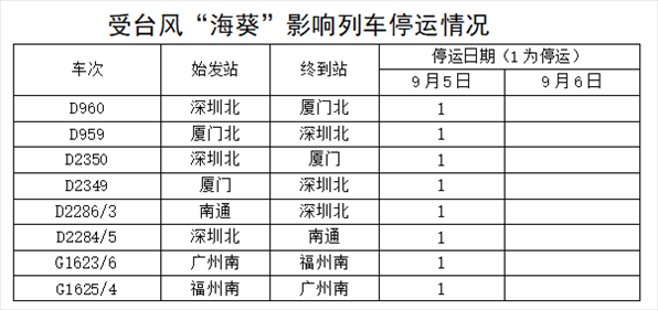 據(jù)中央氣象臺消息,今年第11號臺風“??庇诮裉欤?月5日)早晨5點20分前后在福建省東山縣沿海登陸,福建東部部分地區(qū)將有大暴雨,并伴有短時強降水,局地有雷暴大風等強對流天氣。為防范臺風影響,保障鐵路運輸安全,中國鐵路南昌局集團有限公司繼續(xù)調(diào)整部分旅客列車運行方案,停運管內(nèi)途經(jīng)杭深線福州南至詔安,龍漳線龍巖至漳州,昌福線三明北至福州等區(qū)段旅客列車。同時,加開15趟旅客列車,方便旅客出行。