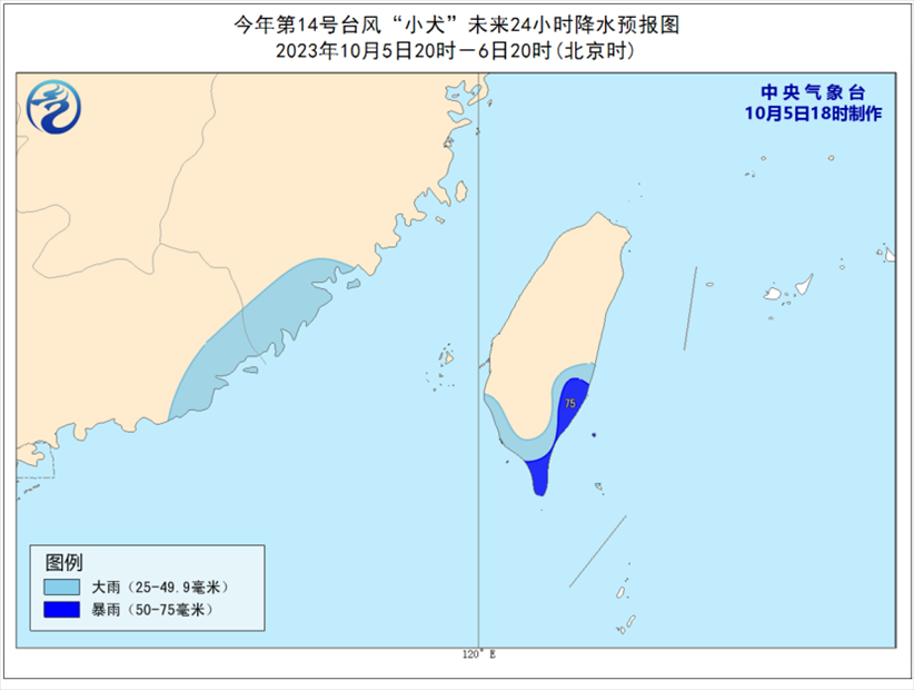 降水預(yù)報(bào):5日20時(shí)至6日20時(shí),臺(tái)灣島南部、福建東南部、廣東東北部等地將有大雨或暴雨(50-75毫米)。