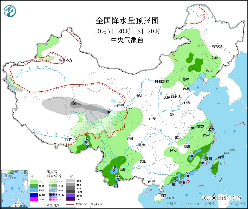 10月6日20時至7日20時,新疆南疆盆地西部沿山地區(qū)、青海南部、西藏東部等地有小到中雪或雨夾雪;西藏東南部、四川盆地東部和南部、云南中東部、福建中南部、廣東東部、海南島南部、臺灣島西部等地部分地區(qū)有中到大雨,其中,廣東東部和福建南部沿海等地局部地區(qū)有暴雨(50~65毫米)。內(nèi)蒙古中東部、遼東半島、浙江東部沿海等地部分地區(qū)有4~6級風(fēng),西藏中部部分地區(qū)有6~7級風(fēng)。臺灣海峽將有6~7級、陣風(fēng)8級的東北風(fēng),南海東北部海域?qū)⒂?~9級、陣風(fēng)10級的偏北風(fēng)(見圖1)。