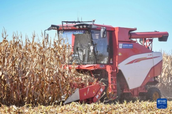 10月19日,在中國科學(xué)院“黑土糧倉”科技會戰(zhàn)長春示范區(qū)公主嶺示范基地,無人駕駛農(nóng)機(jī)在收獲玉米。