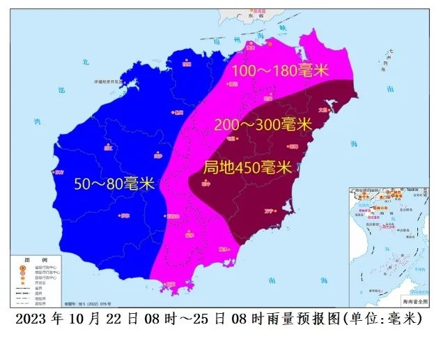 預(yù)計,10月22日08時~25日08時各地累積雨量:文昌、瓊海、瓊中、屯昌和萬寧200~300毫米、局地450毫米,???、澄邁、定安、保亭、陵水和三亞100~180毫米,其余市縣50~80毫米。