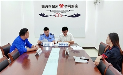 圖④:臨海法院執(zhí)行法官與拘留所民警共同開展調(diào)解,促成雙方當(dāng)事人達(dá)成執(zhí)行和解。