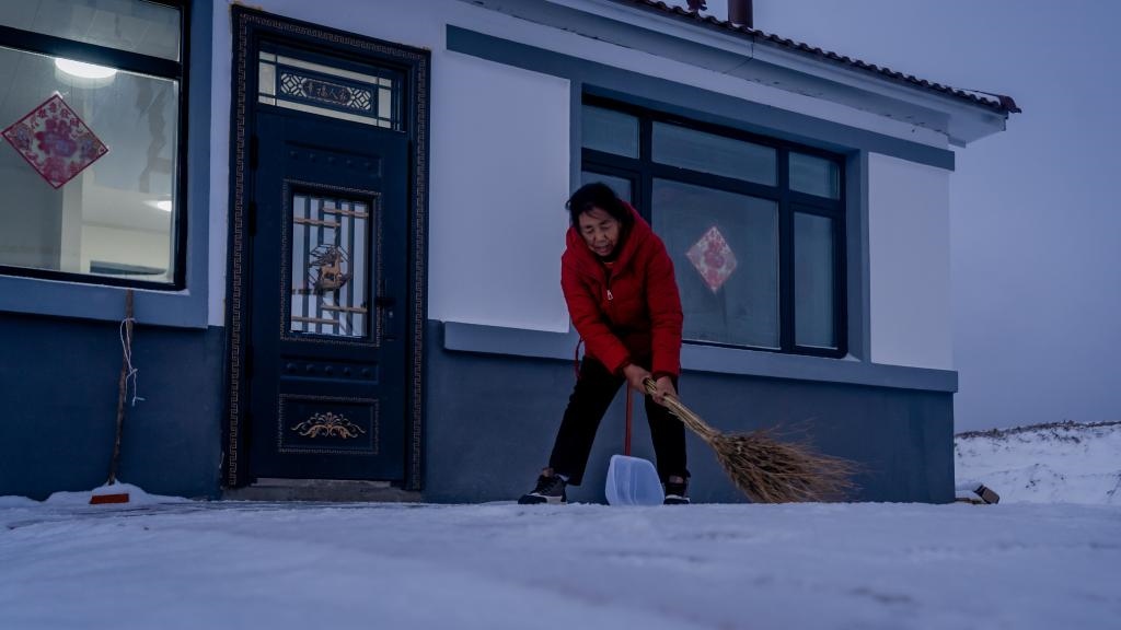 11月23日傍晚,開(kāi)原鎮(zhèn)新開(kāi)村村民徐中仁在新房子門(mén)前清掃積雪。新華社記者唐成卓 攝