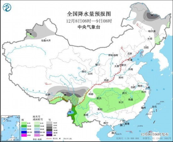 全國(guó)降水量預(yù)報(bào)圖(12月6日08時(shí)-7日08時(shí))