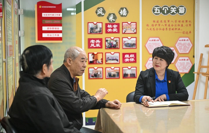 在天津市和平區(qū)勸業(yè)場(chǎng)街道兆豐路社區(qū)“家事驛站”,社區(qū)黨委書(shū)記王玉枝(右)聆聽(tīng)社區(qū)鄰里協(xié)調(diào)員的協(xié)調(diào)情況(12月8日攝)。