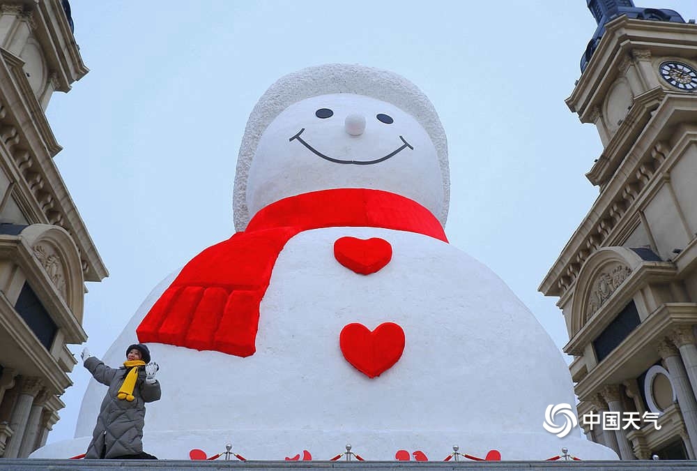 萌萌噠!哈爾濱巨型雪人亮相外灘廣場(chǎng),吸引游人打卡。