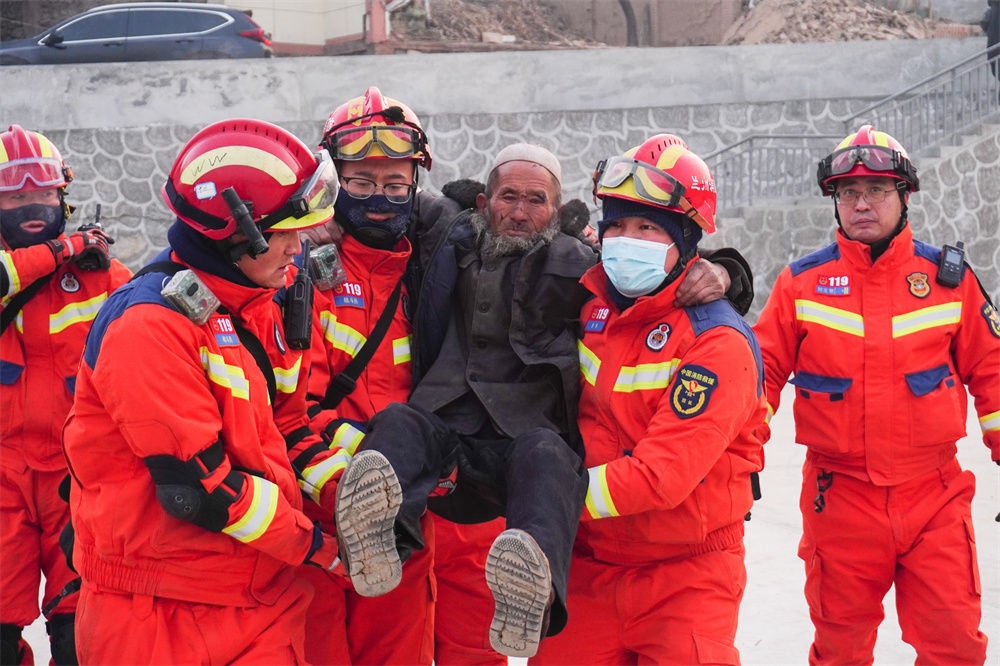 12月19日,在甘肅省臨夏回族自治州積石山保安族東鄉(xiāng)族撒拉族自治縣大河家鎮(zhèn)大河村,消防人員開展救援。新華社記者 馬希平 攝