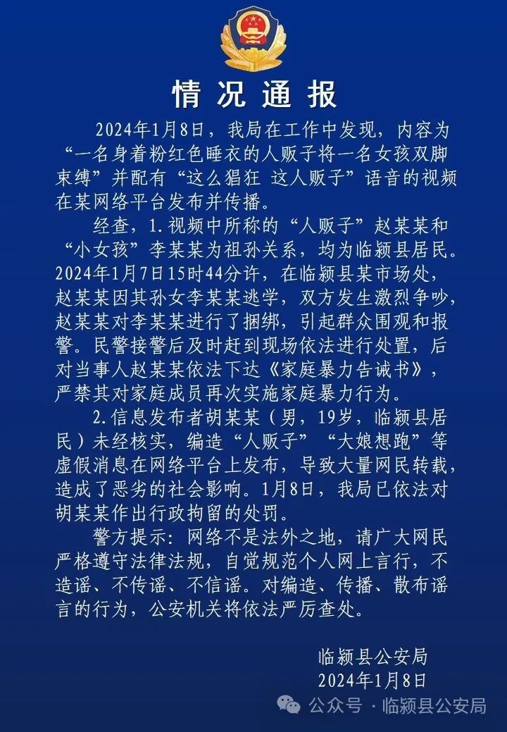 ·河南警方辟謠人販子將女孩雙腳綁縛:兩人系祖孫關(guān)系,造謠者被行政拘留。