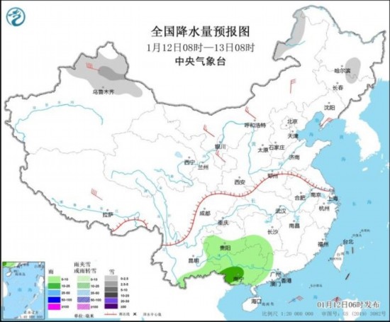 全國降水量預(yù)報圖(1月12日08時-13日08時)