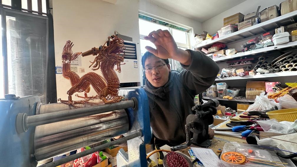 在村民楊訓(xùn)政不大的鋁編工作室內(nèi),簡易貨架上一排排銅色鋁線編制成的藝術(shù)品讓人目不暇接。一條條鋁制彈簧經(jīng)過村民巧妙處理后,成了工藝品市場的搶手貨:發(fā)財(cái)樹、恐龍、摩托車、機(jī)器人……“我這鋁編雖然產(chǎn)量低、規(guī)模小,訂單可已經(jīng)排到了今年10月底。龍年將至,來自海內(nèi)外的訂單讓大家年前忙得不亦樂乎。”楊訓(xùn)政一邊用鉗子擺弄著鋁編小龍,一邊告訴記者。