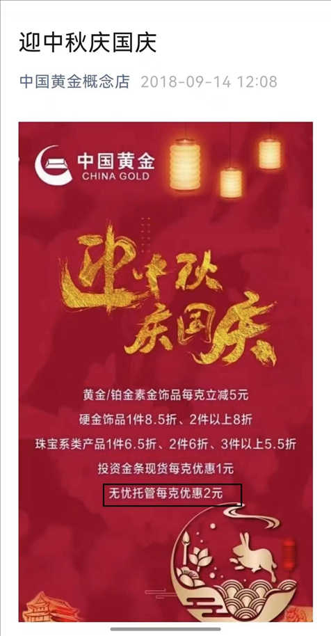 2018年,涉事門店的公眾號仍在宣傳無憂托管業(yè)務(wù),消費者質(zhì)疑中國黃金方面,為何沒有發(fā)現(xiàn)這家店經(jīng)營公司禁止的業(yè)務(wù)/受訪者供圖