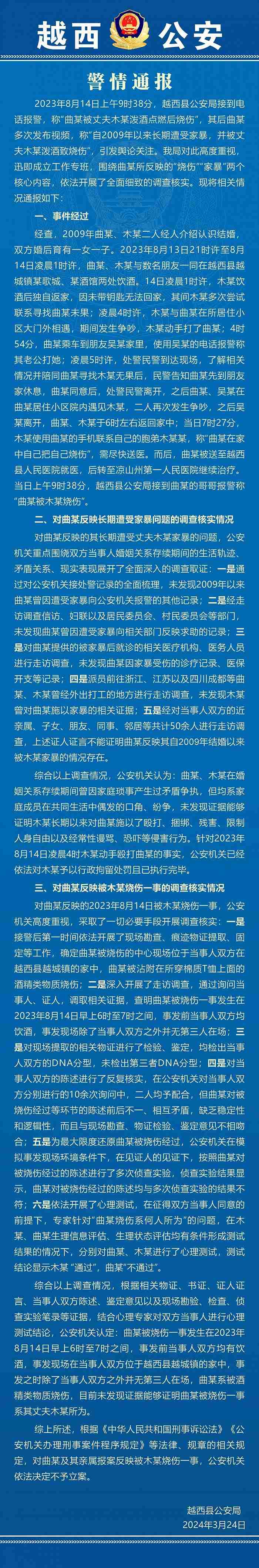 3月24日,越西縣公安局對(duì)此發(fā)布警情通報(bào)稱,綜合調(diào)查情況,根據(jù)相關(guān)物證、書證、證人證言、當(dāng)事人雙方陳述、鑒定意見(jiàn)以及現(xiàn)場(chǎng)勘驗(yàn)、檢查、偵查實(shí)驗(yàn)筆錄等證據(jù),結(jié)合心理專家對(duì)雙方當(dāng)事人進(jìn)行心理測(cè)試結(jié)論,公安機(jī)關(guān)認(rèn)定:曲某被燒傷一事發(fā)生在2023年8月14日早上6時(shí)至7時(shí)之間,事發(fā)前當(dāng)事人雙方均有飲酒,事發(fā)現(xiàn)場(chǎng)在當(dāng)事人雙方位于越西縣越城鎮(zhèn)的家中,事發(fā)之時(shí)除了當(dāng)事人雙方之外并無(wú)第三人在場(chǎng),曲某系被酒精類物質(zhì)燒傷,目前未發(fā)現(xiàn)證據(jù)能夠證明曲某被燒傷一事系其丈夫木某所為。警方表示,對(duì)曲某及其親屬報(bào)案反映被木某燒傷一事,公安機(jī)關(guān)依法決定不予立案。
