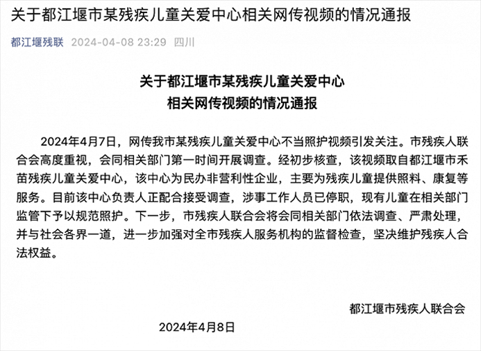 央視網(wǎng)消息:都江堰殘聯(lián)4月8日通報,4月7日,網(wǎng)傳都江堰市某殘疾兒童關愛中心不當照護視頻引發(fā)關注。市殘疾人聯(lián)合會高度重視,會同相關部門第一時間開展調查。經(jīng)初步核查,該視頻取自都江堰市禾苗殘疾兒童關愛中心,該中心為民辦非營利性企業(yè),主要為殘疾兒童提供照料、康復等服務。目前該中心負責人正配合接受調查,涉事工作人員已停職,現(xiàn)有兒童在相關部門監(jiān)管下予以規(guī)范照護。下一步,市殘疾人聯(lián)合會將會同相關部門依法調查、嚴肅處理,并與社會各界一道,進一步加強對全市殘疾人服務機構的監(jiān)督檢查,堅決維護殘疾人合法權益。?
