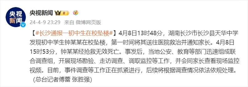 ·湖南長(zhǎng)沙縣通報(bào)初中生在校墜亡:將根據(jù)調(diào)查情況依法依規(guī)處理。