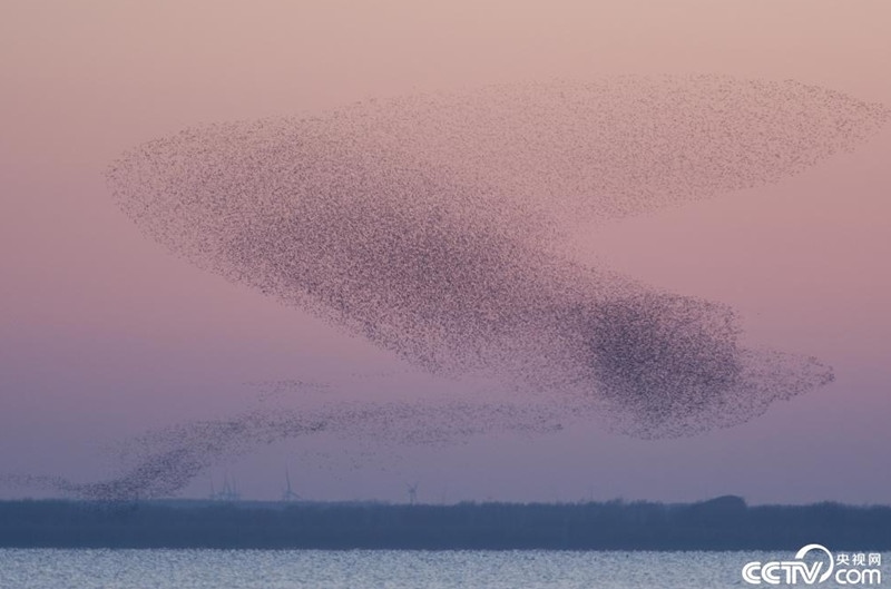 沈陽康平縣臥龍湖生態(tài)區(qū)水域上空,數(shù)萬只花臉鴨同時(shí)與夕陽共舞,形成壯觀的“鳥浪”。