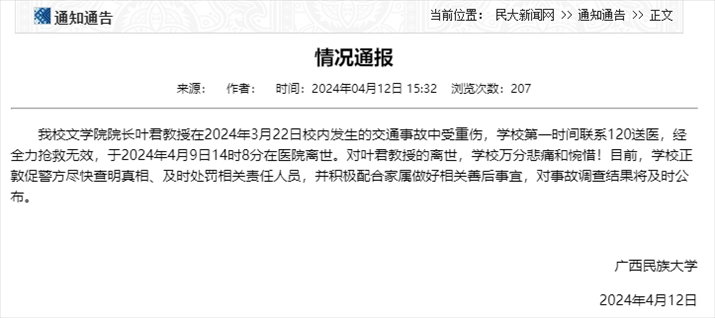 央視網(wǎng)消息:據(jù)廣西民族大學(xué)網(wǎng)站消息,廣西民族大學(xué)4月12日發(fā)布情況通報(bào),該校文學(xué)院院長葉君教授在2024年3月22日校內(nèi)發(fā)生的交通事故中受重傷,學(xué)校第一時(shí)間聯(lián)系120送醫(yī),經(jīng)全力搶救無效,于2024年4月9日14時(shí)8分在醫(yī)院離世。對葉君教授的離世,學(xué)校萬分悲痛和惋惜!目前,學(xué)校正敦促警方盡快查明真相、及時(shí)處罰相關(guān)責(zé)任人員,并積極配合家屬做好相關(guān)善后事宜,對事故調(diào)查結(jié)果將及時(shí)公布。