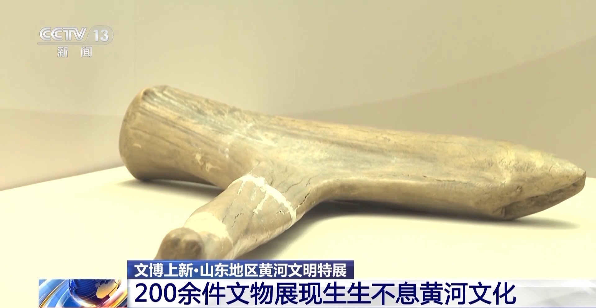 濟(jì)南市博物館陳列展覽部策展人 于筱箏:它是新石器時(shí)代大汶口文化時(shí)期的一件鹿角鋤,它的一面比較圓鈍,可以用來(lái)敲擊比較堅(jiān)硬的物品,比如土塊、石頭等等。另一面比較尖銳,就可以用來(lái)刨、镢、刨坑松土。