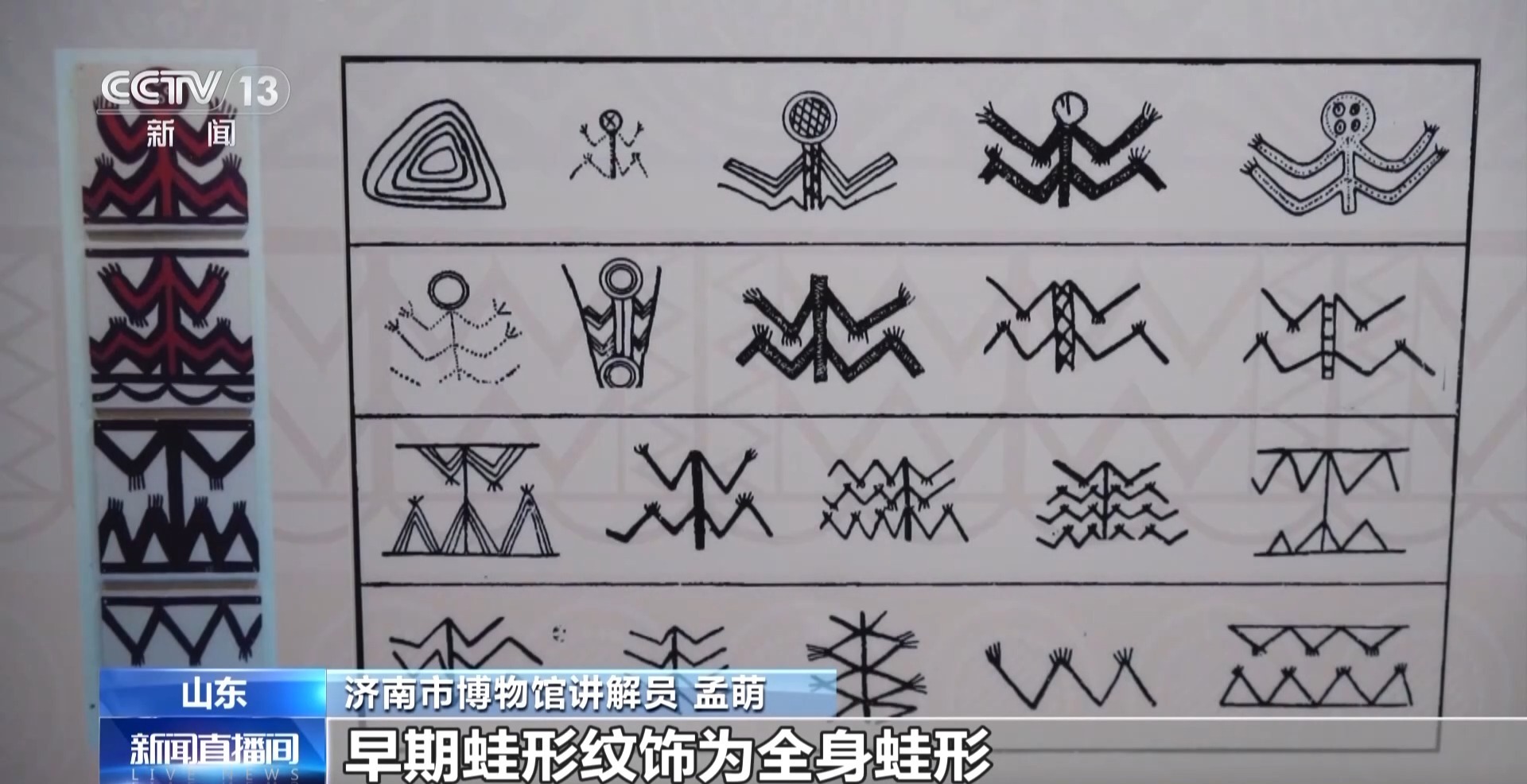 濟(jì)南市博物館講解員 孟萌:早期蛙形紋飾為全身蛙形,在這一時(shí)期蛙頭部往往是圓圈形,里面繪有不同的圖案,而它的四肢往往是波狀紋,并且它的足是有不同的趾,到了中期則變得更為簡(jiǎn)化和自然,而到了晚期變成了一種結(jié)構(gòu)化的圖案。體現(xiàn)了他們希望自己的部落能夠繁衍生息、發(fā)展壯大的美好愿景。