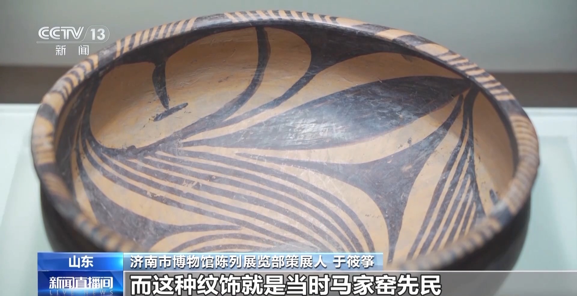 濟(jì)南市博物館陳列展覽部策展人 于筱箏:例如我們此次展覽中展出的兩件非常重要的漩渦紋彩陶壺和漩渦紋彩陶盆,其上均是以漩渦紋為主要紋飾,而這種紋飾就是當(dāng)時(shí)馬家窯先民對(duì)于黃河奔騰河水的一種非常概括,以及極富想象力的描繪,它們也是新石器時(shí)代晚期黃河文明形成與發(fā)展的一種重要見證。