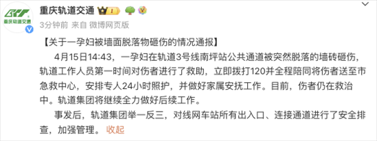 央視網(wǎng)消息:據(jù)@重慶軌道交通 微博通報(bào),4月15日14:43,一孕婦在軌道3號(hào)線南坪站公共通道被突然脫落的墻磚砸傷,軌道工作人員第一時(shí)間對(duì)傷者進(jìn)行了救助,立即撥打120并全程陪同將傷者送至市急救中心,安排專人24小時(shí)照護(hù),并做好家屬安撫工作。目前,傷者仍在救治中。軌道集團(tuán)將繼續(xù)全力做好后續(xù)工作。