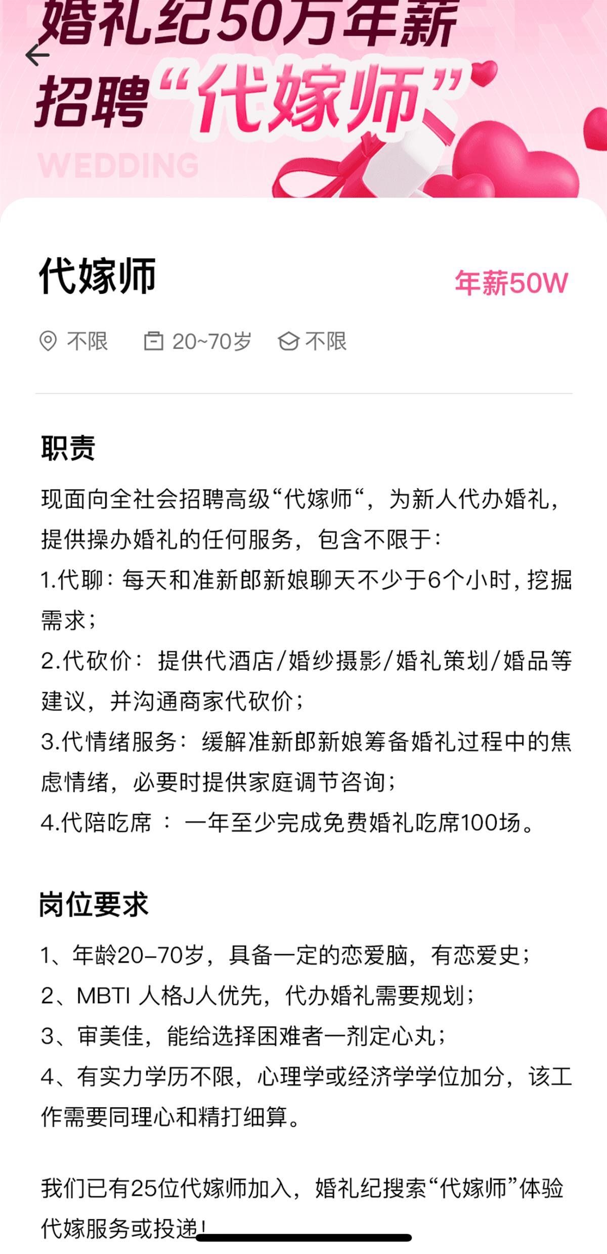 點擊該頁面下方的“成為代嫁師”按鈕,便進入了網(wǎng)上流傳的關(guān)于代嫁師的崗位介紹:“代嫁師”的工作內(nèi)容包含但不限于代聊、代砍價、代情緒服務(wù)、代陪吃席等,其中代聊服務(wù)要求“每天和準(zhǔn)新郎新娘聊天不少于6個小時”,代陪吃席要求“一年至少完成免費婚禮吃席100場”。崗位要求:1、年齡20-70歲,具備一定戀愛腦,有戀愛史;2、MBTI人格J人優(yōu)先,代辦婚禮需要規(guī)劃;3、審美佳,能給選擇困難者一劑定心丸;4、有實力學(xué)歷不限,心理學(xué)或經(jīng)濟學(xué)學(xué)位加分,該工作需要同理心和精打細算。