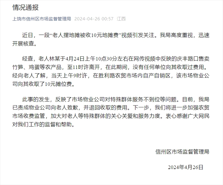 經(jīng)查,老人林某于4月24日上午10點(diǎn)30分左右在網(wǎng)傳視頻中反映的慶豐路口售賣竹筍、雞蛋等農(nóng)產(chǎn)品,至11時(shí)許離開,在此期間,沒(méi)有任何單位向其收取過(guò)費(fèi)用。經(jīng)向老人了解,當(dāng)天上午9時(shí)許,在勝利路農(nóng)貿(mào)市場(chǎng)內(nèi)自產(chǎn)自銷區(qū),該市場(chǎng)物業(yè)公司向其收取了10元攤位費(fèi)。