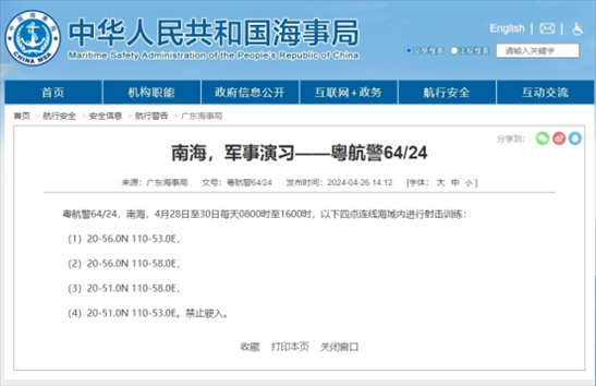 ·廣東海事局發(fā)布航行警告:南海部分海域進(jìn)行射擊訓(xùn)練,禁止駛?cè)搿?/p>