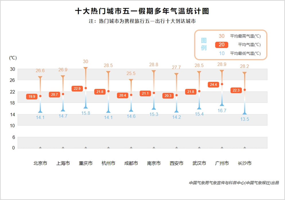 南北方熱門城市“五一”假期的氣溫差異并不大,都非常適宜出行,最高氣溫均在25℃以上。重慶是唯一一個在“五一”期間平均最高氣溫達到30℃的熱門城市,熱度與溫度都在高位,前往還需注意防暑降溫。